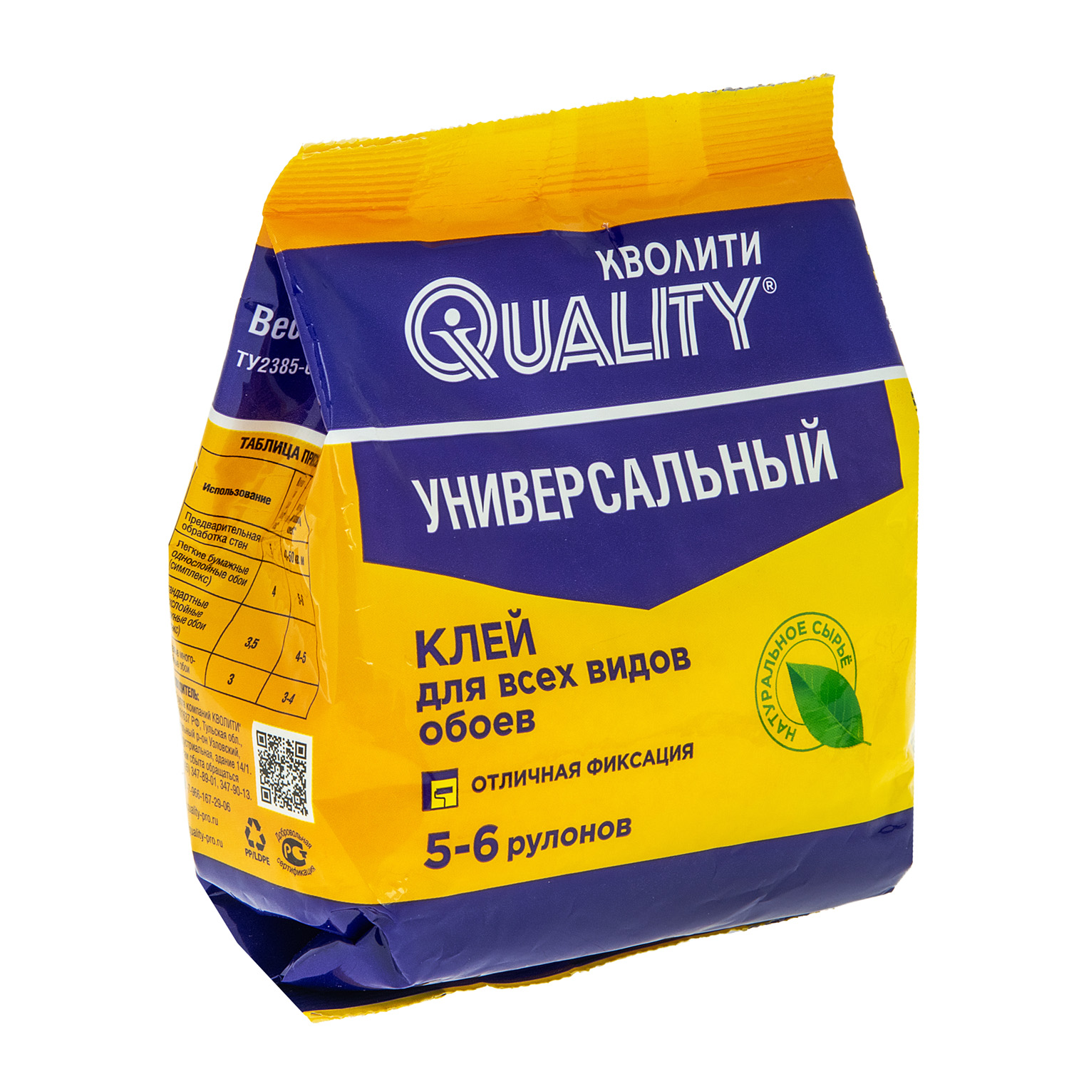 Клей для обоев универсальный Quality 150 г обеспечивает надежную фиксацию обоев любого типа. Изготовлен на основе натурального сырья. В составе: модифицированный картофельный крахмал, противогрибковые добавки, препятствующие образованию плесени.