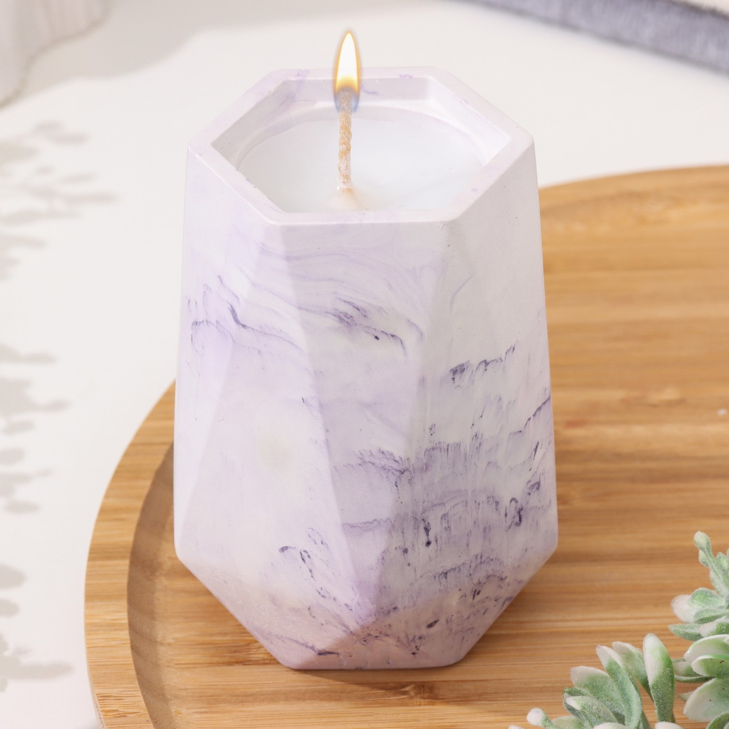 Свеча "Ваза. Мрамор" в подсвечнике из гипса с гранями,7х10см,мрамор с фиолетовыми полосками 10059812