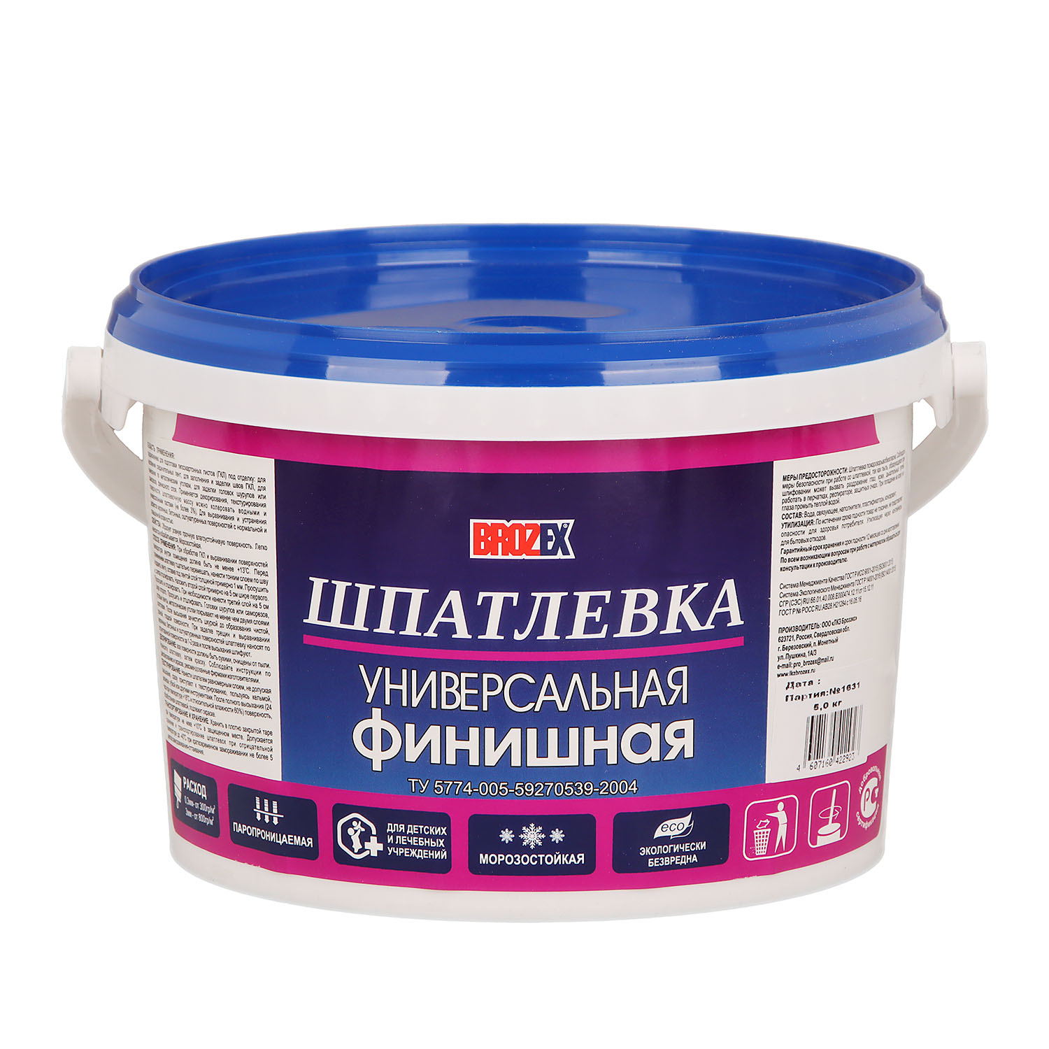 Шпатлевка финишная универсальная BROZEX 5 кг предназначена для подготовки гипсокартонных листов под отделку, выравнивания кирпичных, бетонных, оштукатуренных оснований, а также для декорирования, текстурирования поверхностей. Образует ровное прочное влагостойкое покрытие. Легко наносится и обрабатывается. Возможна колеровка шпатлевочной массы водными и универсальными пастами.