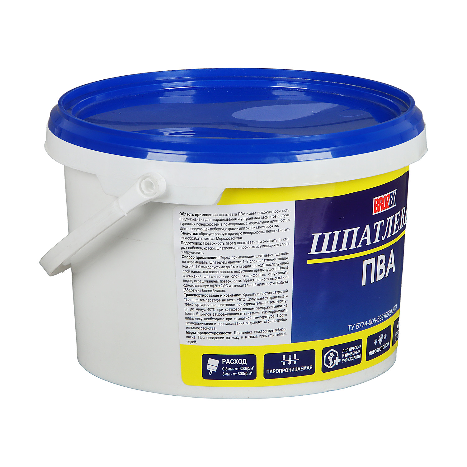 Шпатлевка ПВА BROZEX 5 кг обладает высокой прочностью, образует ровную износостойкую поверхность. Проста в нанесении и обработке.