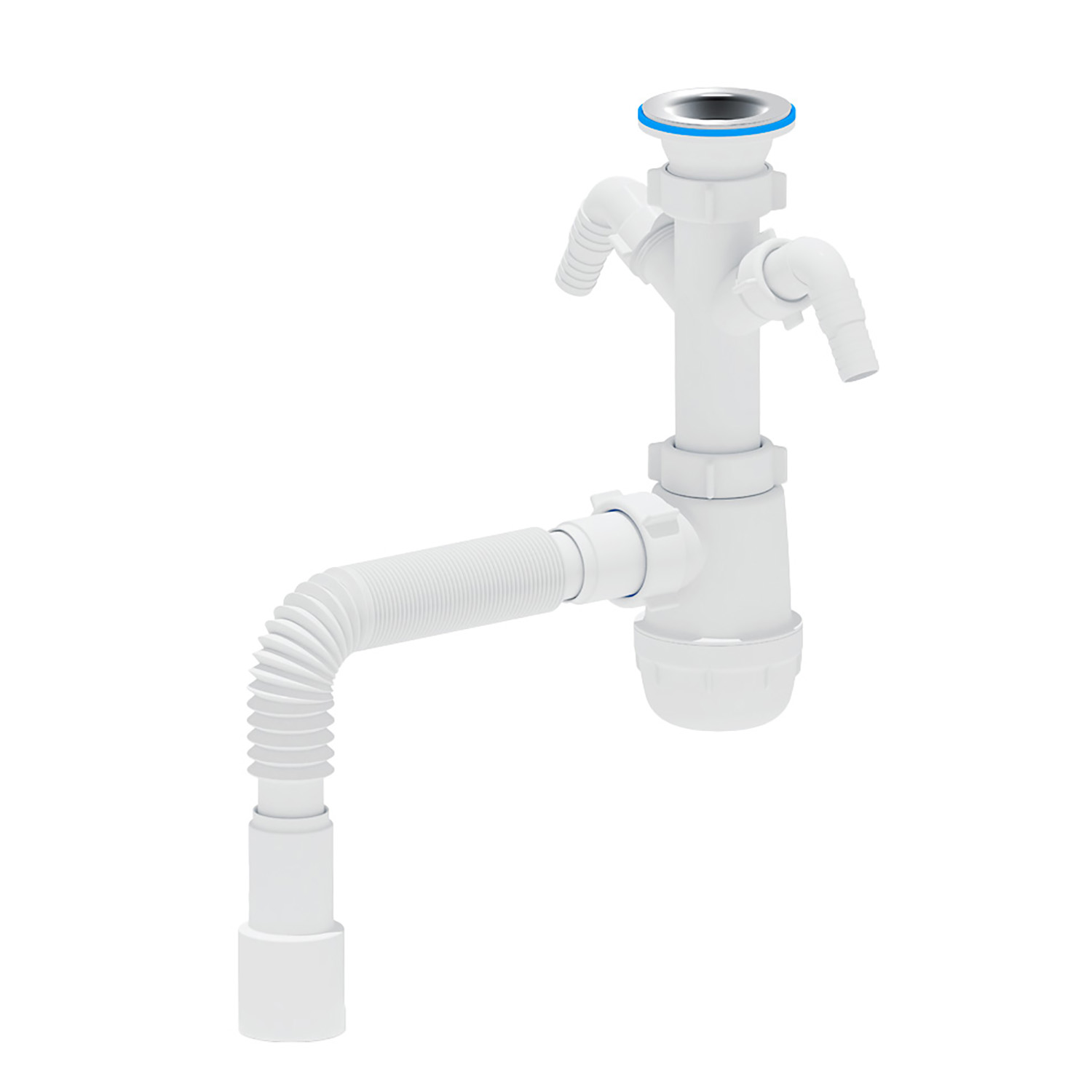 Сифон для кухонных моек с диаметром сливного отверстия 50мм, бутылочного типа с увеличенным корпусом. С разборным выпуском и нержавеющей решеткой , с двумя отводами для подключения бытовой техники. Для подключения к канализации комплектуется гибкой трубой 40*40/50мм.