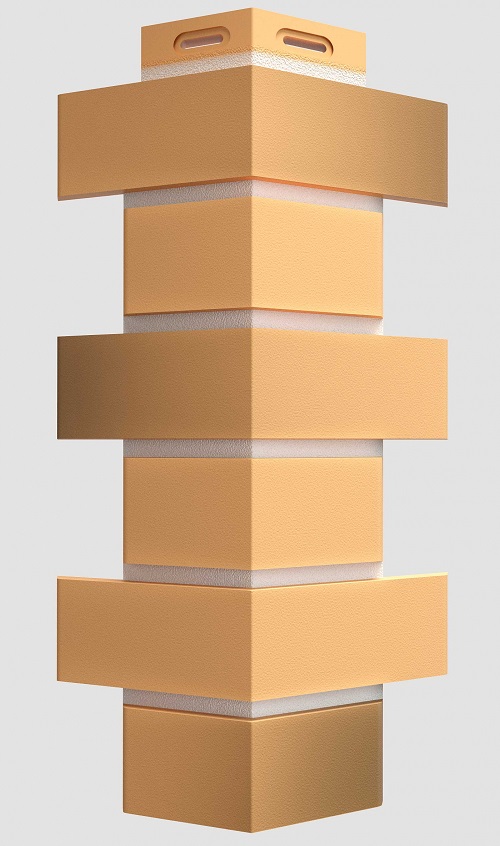 Светло-песочная основа с контрастными белыми швами идеально подходит для классических комбинаций «светлый фасад — темная крыша». Используйте углы цвета «желтый жженый», чтобы скрыть края фасадных панелей и создать эффект цельной облицовки.