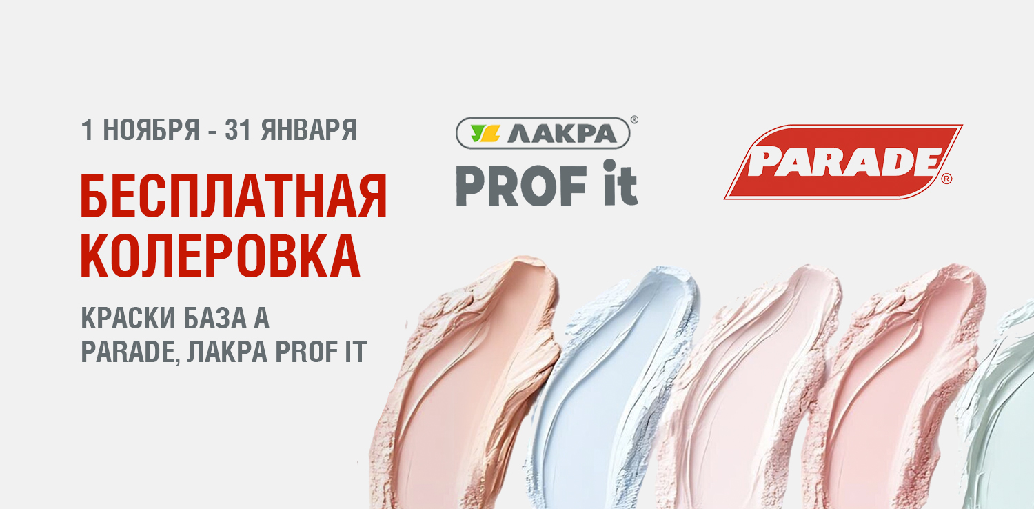 С 1 ноября 2025 по 31 января 2026 при покупке краски брендов Parade, Лакра (база А) - услуга колеровки по вееру ArtParade предоставляется бесплатно. Технология компьютерной колеровки поможет вам воплотить любую дизайнерскую задумку. Просто выберите идеальный оттенок из палитр «Светлая классика», «Нежная пастель» или «Элегантный нейтральный».